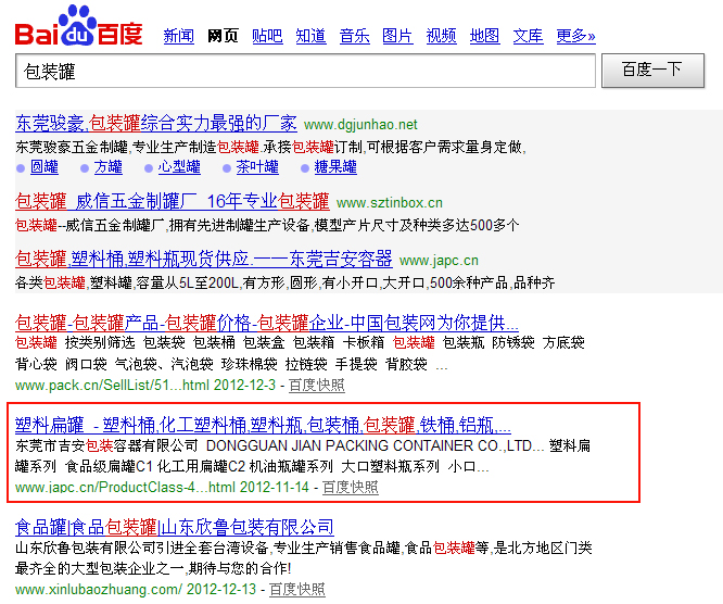 這次我們選了一個重點的詞作為各位參考。包裝罐一直穩居百度首頁前三,http://www.japc.cn/ProductClass-4-1.html