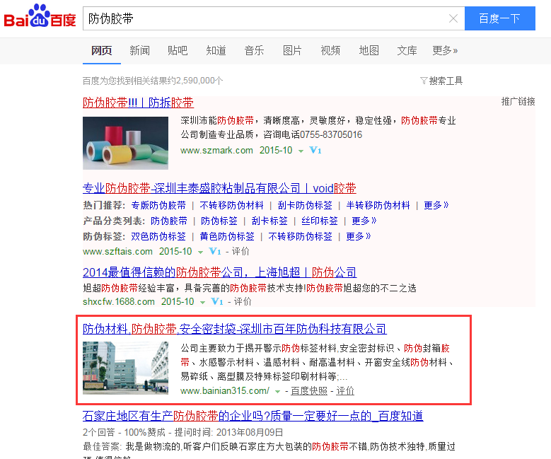 【優化】 百年防偽:防偽材料,防偽膠帶,防偽封箱膠帶等詞排在百度首位